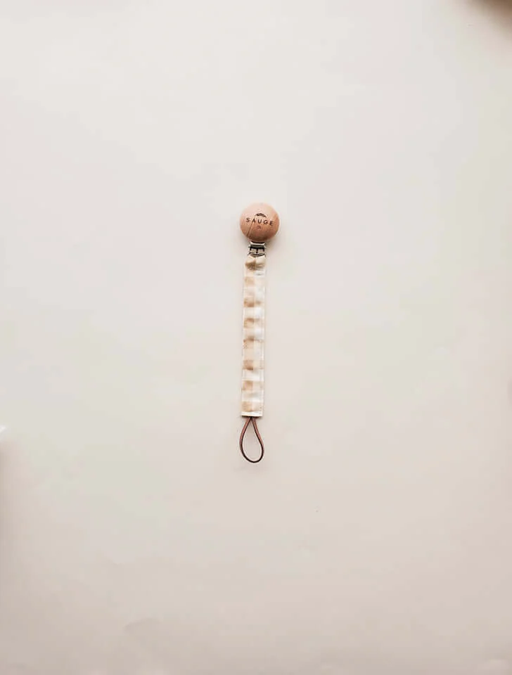 Les attaches suces sont faites de retailles de tissus pour rester dans l’optique d’une entreprise zéro déchets. La tête en bois est gravé du logo de Sauge & co et est huilé à la main à l’huile de coco. Le tissus est fait d’un mélange de lin et coton. La suce sera attachée d’un cordon de suède vegan.