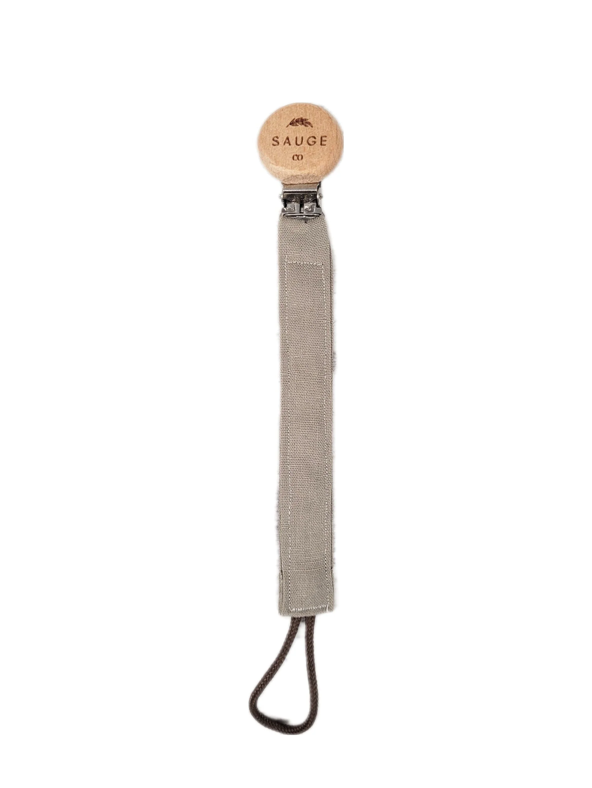Les attaches suces sont faites de retailles de tissus pour rester dans l’optique d’une entreprise zéro déchets. La tête en bois est gravé du logo de Sauge & co et est huilé à la main à l’huile de coco. Le tissus est fait d’un mélange de lin et coton. La suce sera attachée d’un cordon de suède vegan.