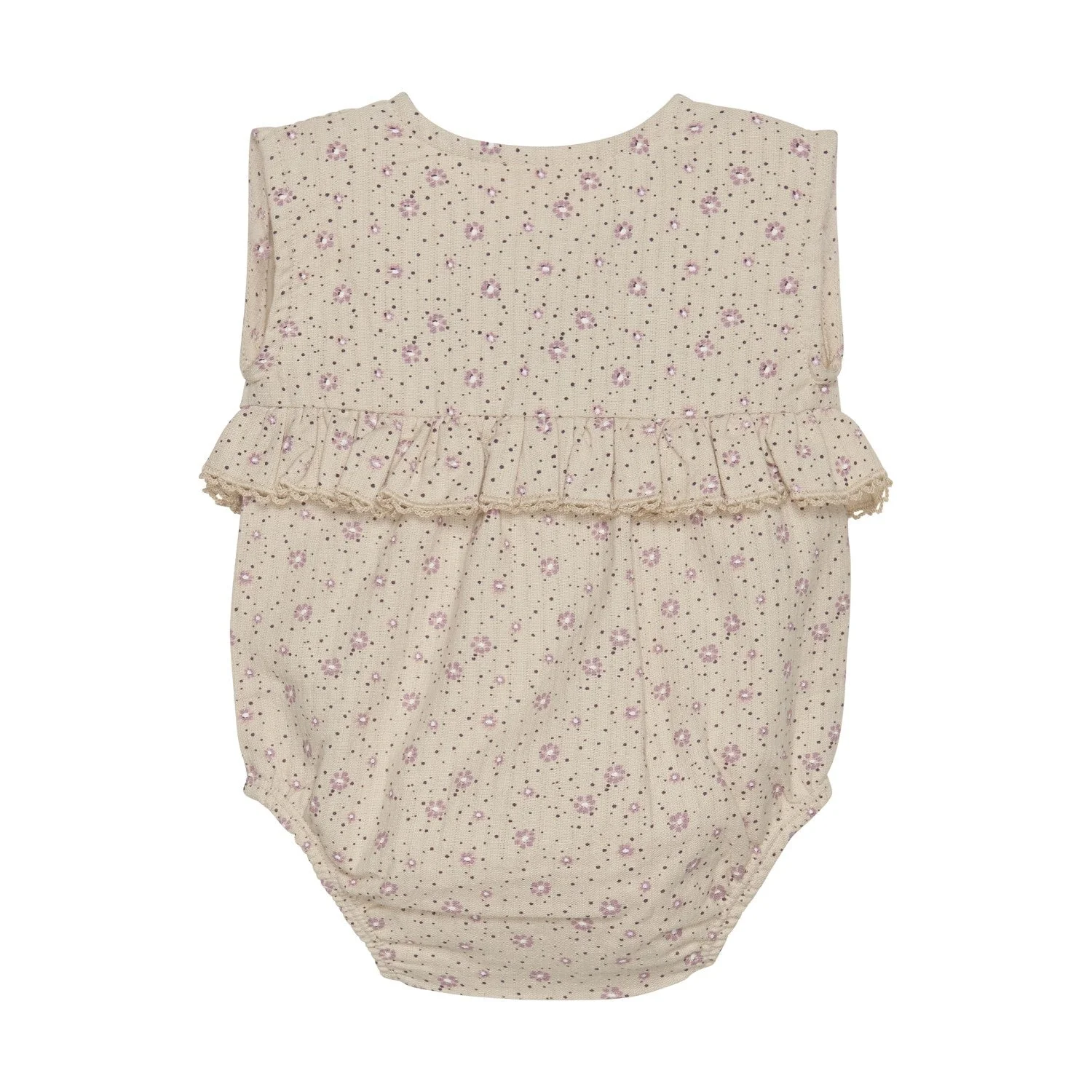 Barboteuse à fond beige et petites fleurs roses de Fixoni. Ses petits frisons sur le côté lui ajoutent une petite touche féminine supplémentaire que nous adorons. Au bas se trouvent des boutons pressions pour faciliter les changements de couches.