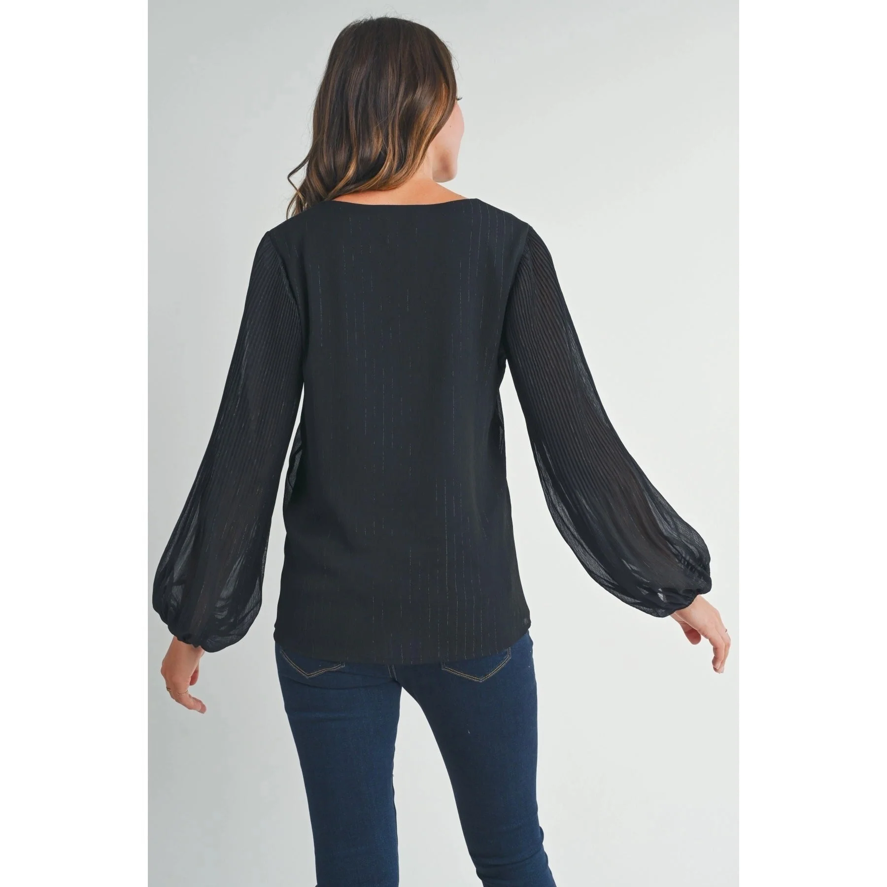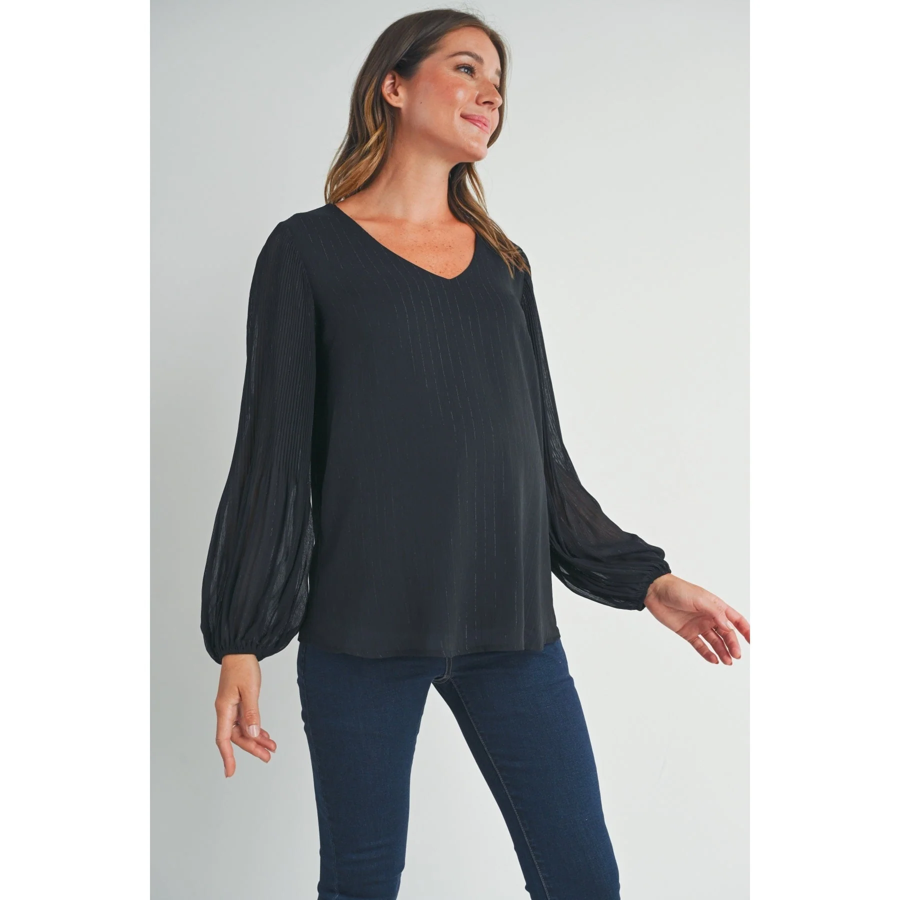 Jolie blouse noire plissée à manches longues de d’Hello Miz. La coupe ample vous offrira confort et élégance tout au long de votre grossesse. À noter que cette blouse peut très bien se porte après la grossesse.