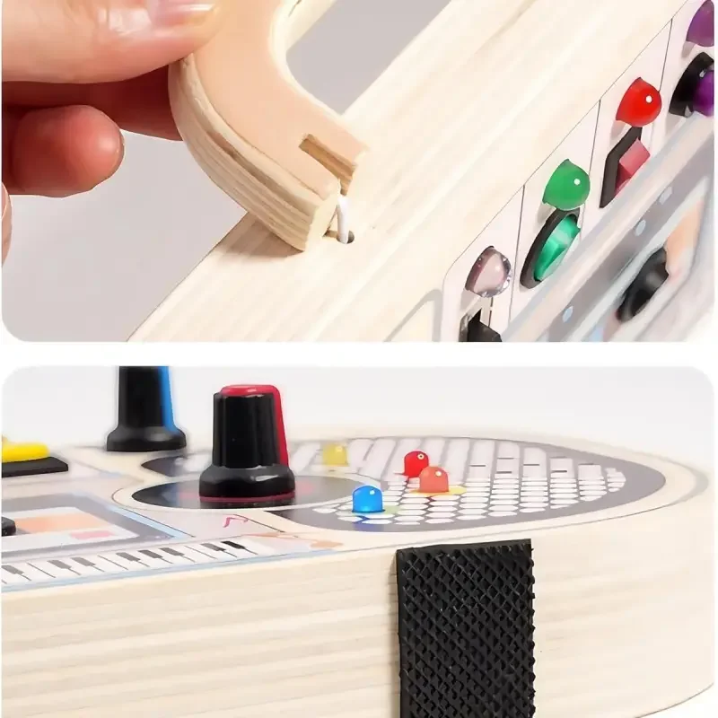 Grâce aux couleurs, sons et textures variées, ce busy board favorise l’apprentissage par le jeu.