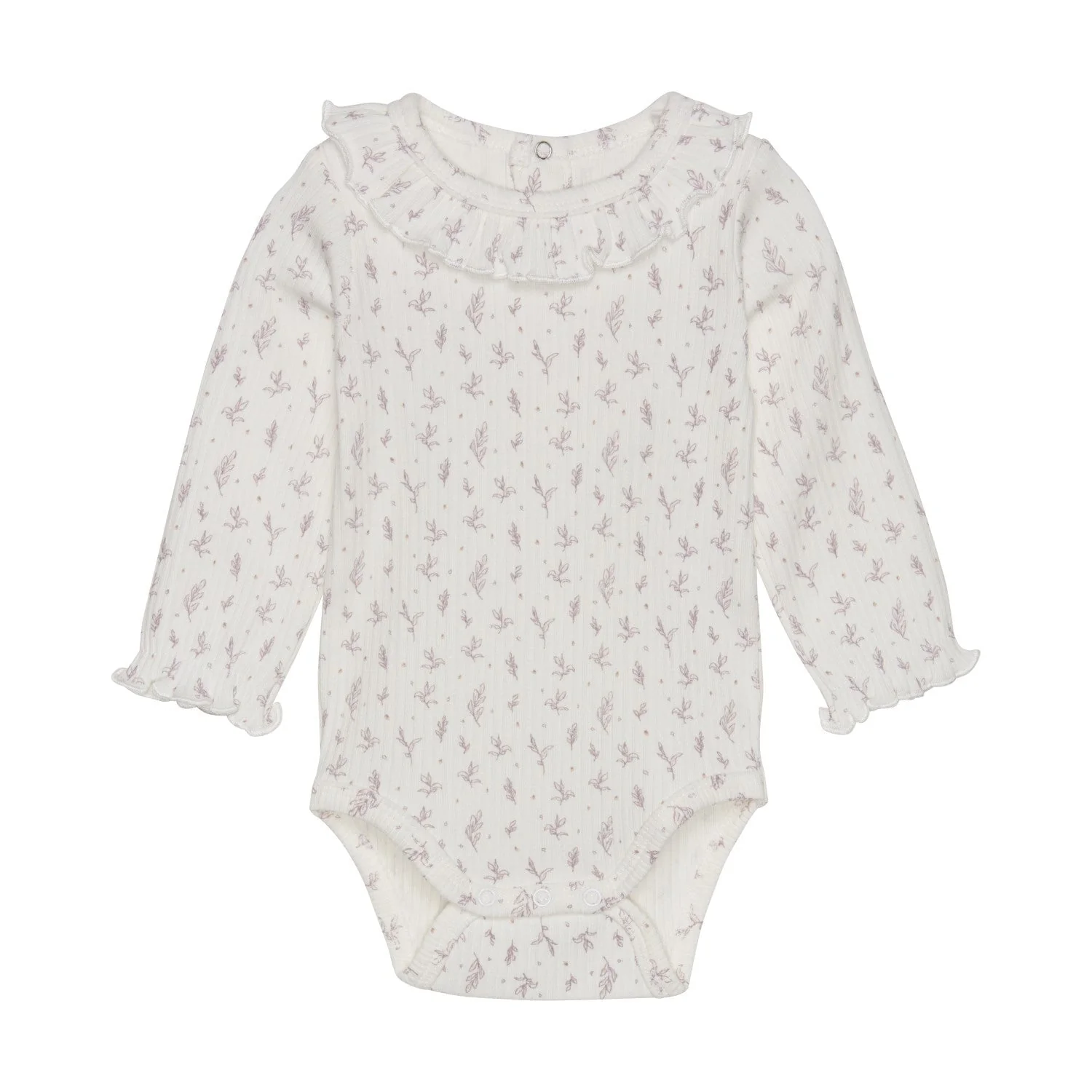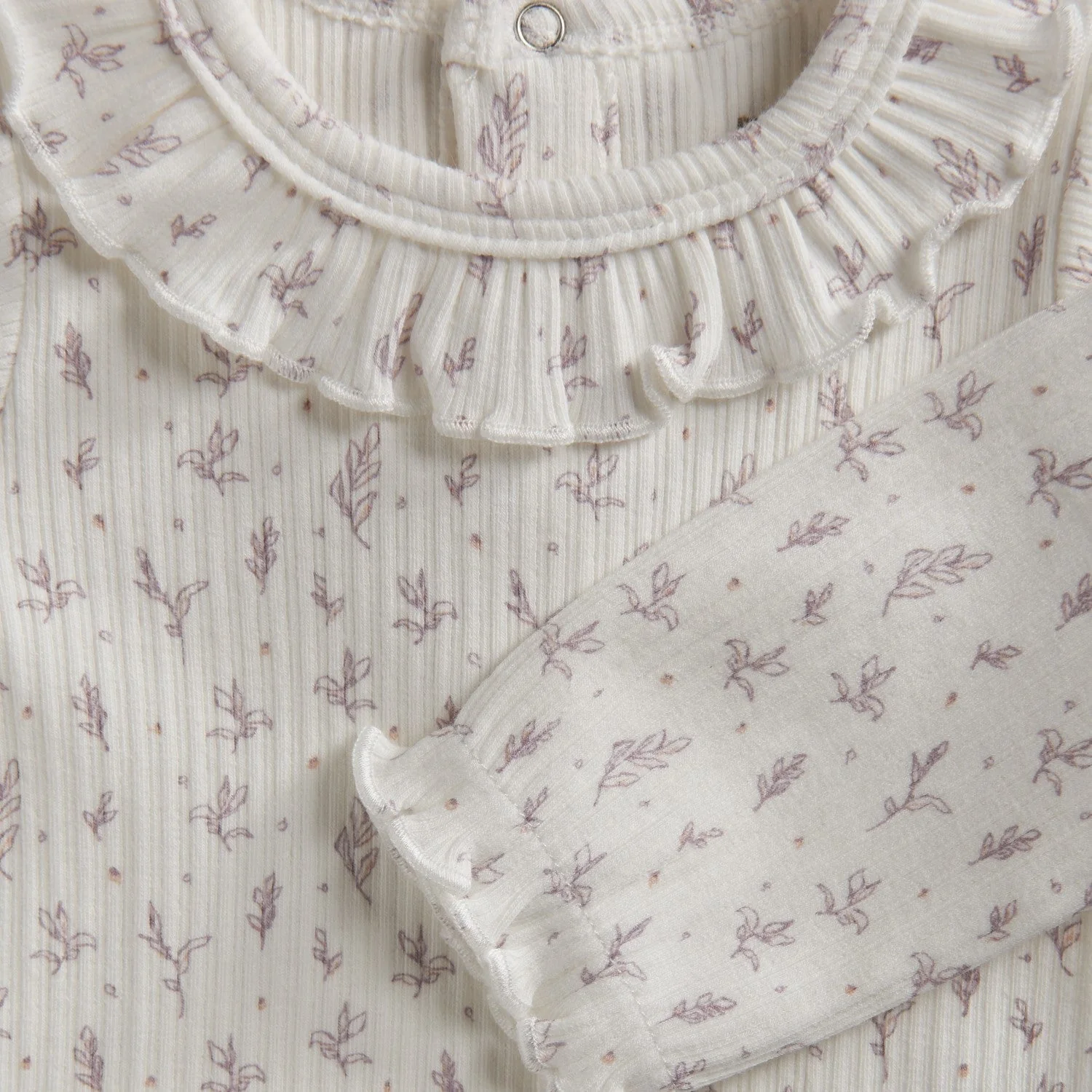 Cache-couches blanc avec son petit motif de feuillage mauve de Fixoni. Son tissu doux et souple offrira tout le confort désiré pour votre mini. Ses frisons au col et aux poignets apporte une touche féminine que nous adorons.