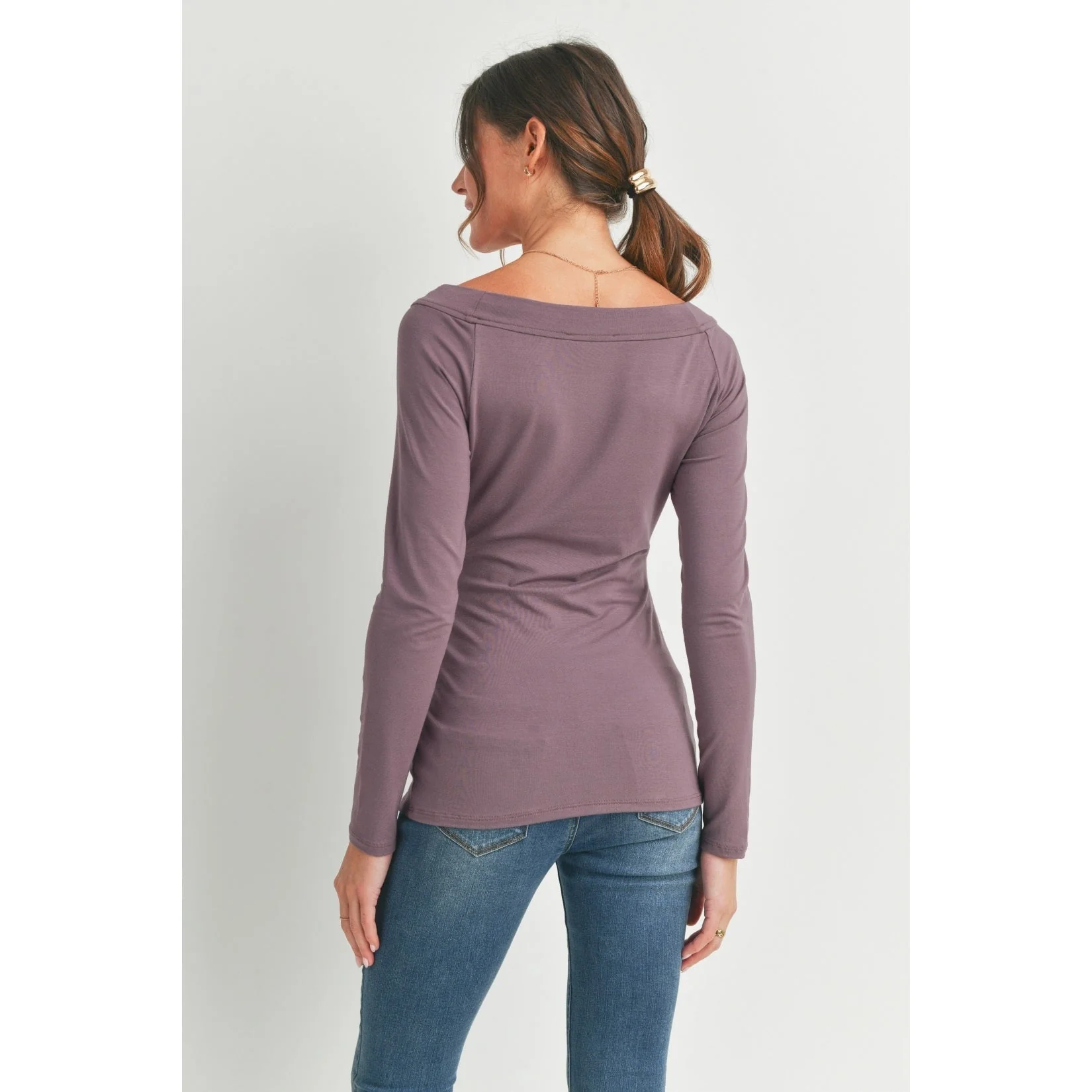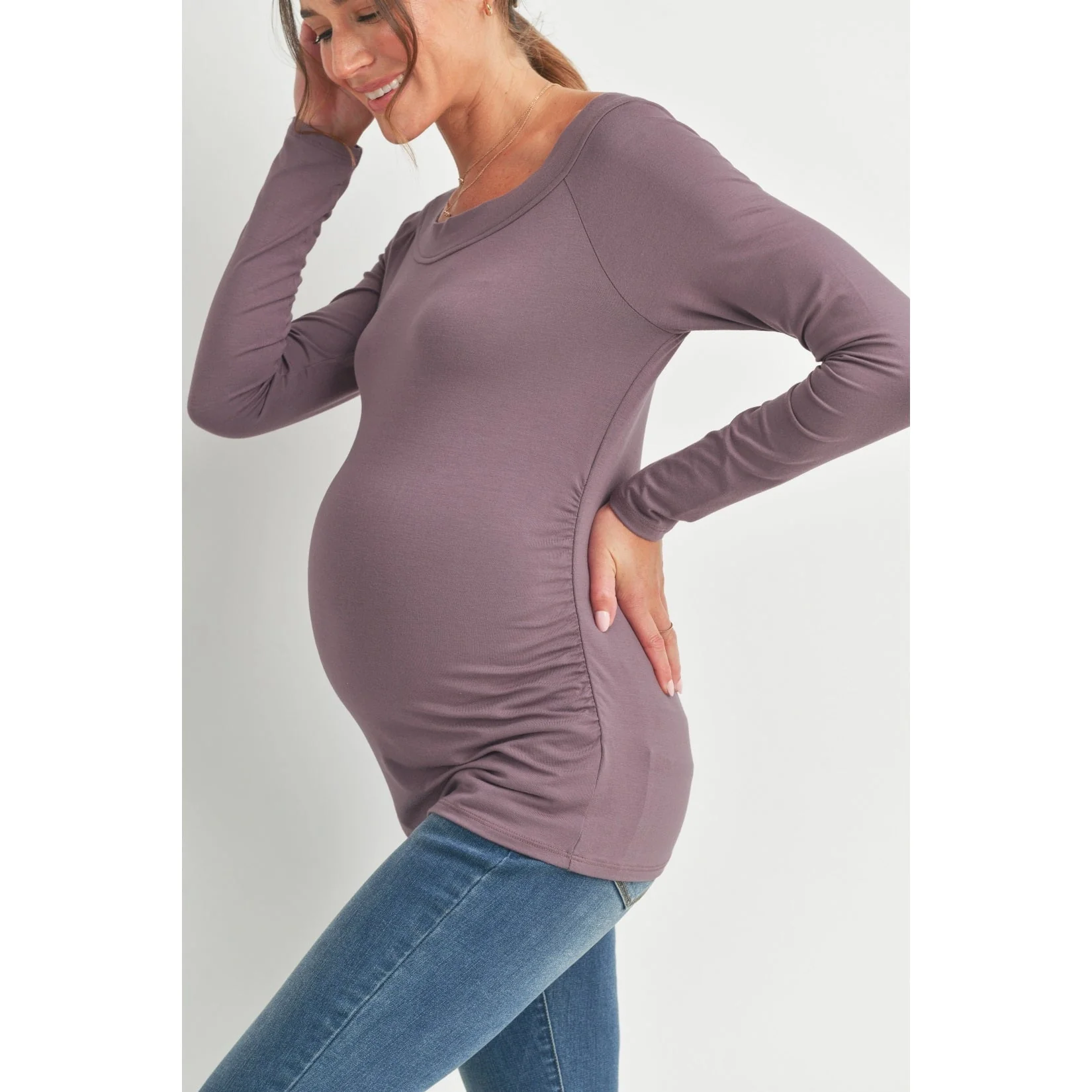 Chandail de maternité mauve cendré de Hello miz. Son tissu doux et extensible vous offrira tout le confort dont vous avez besoin tout au long de votre grossesse. Les petits plis sur le coté mettrons en valeur votre joli ventre grandissant.