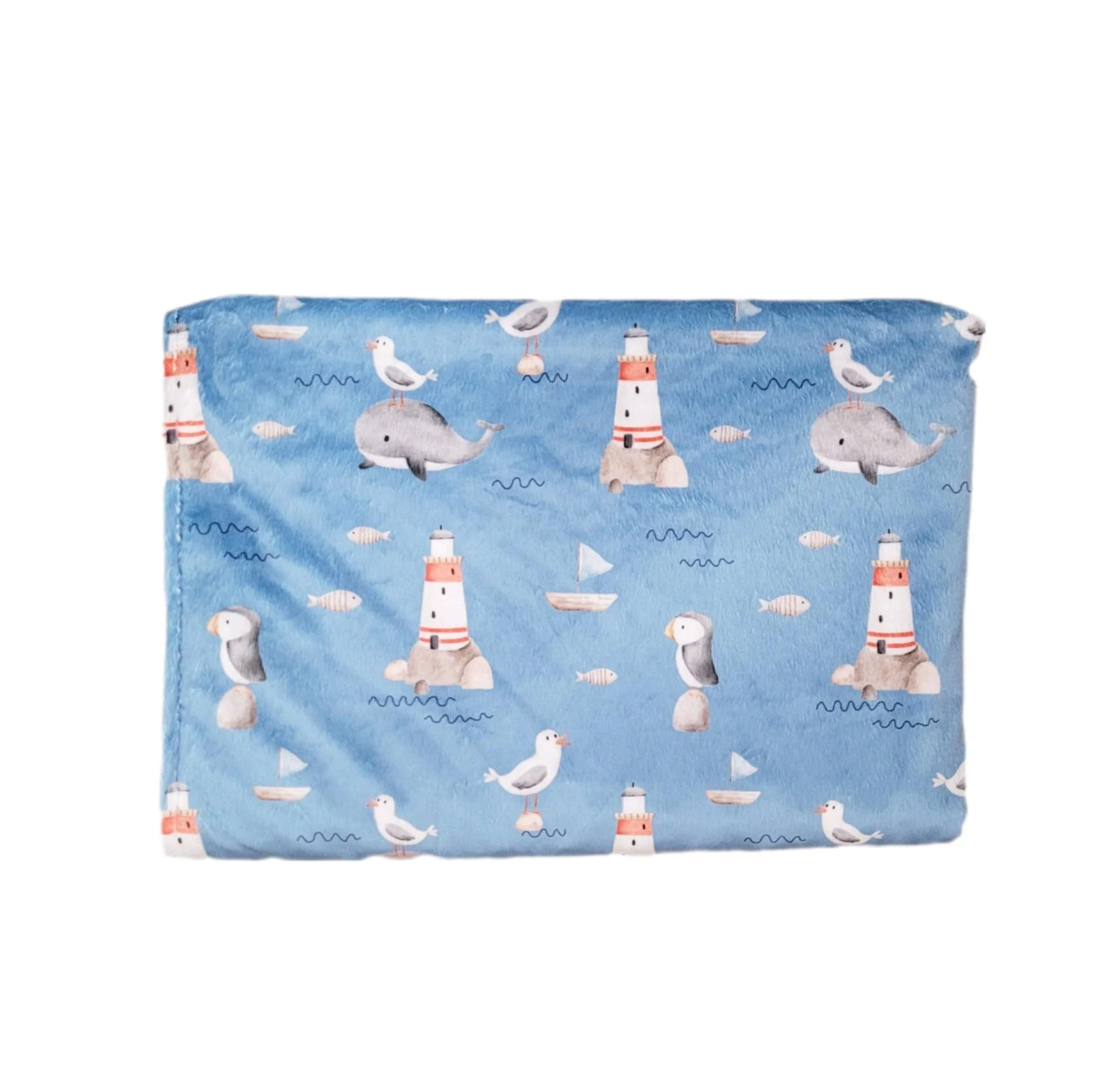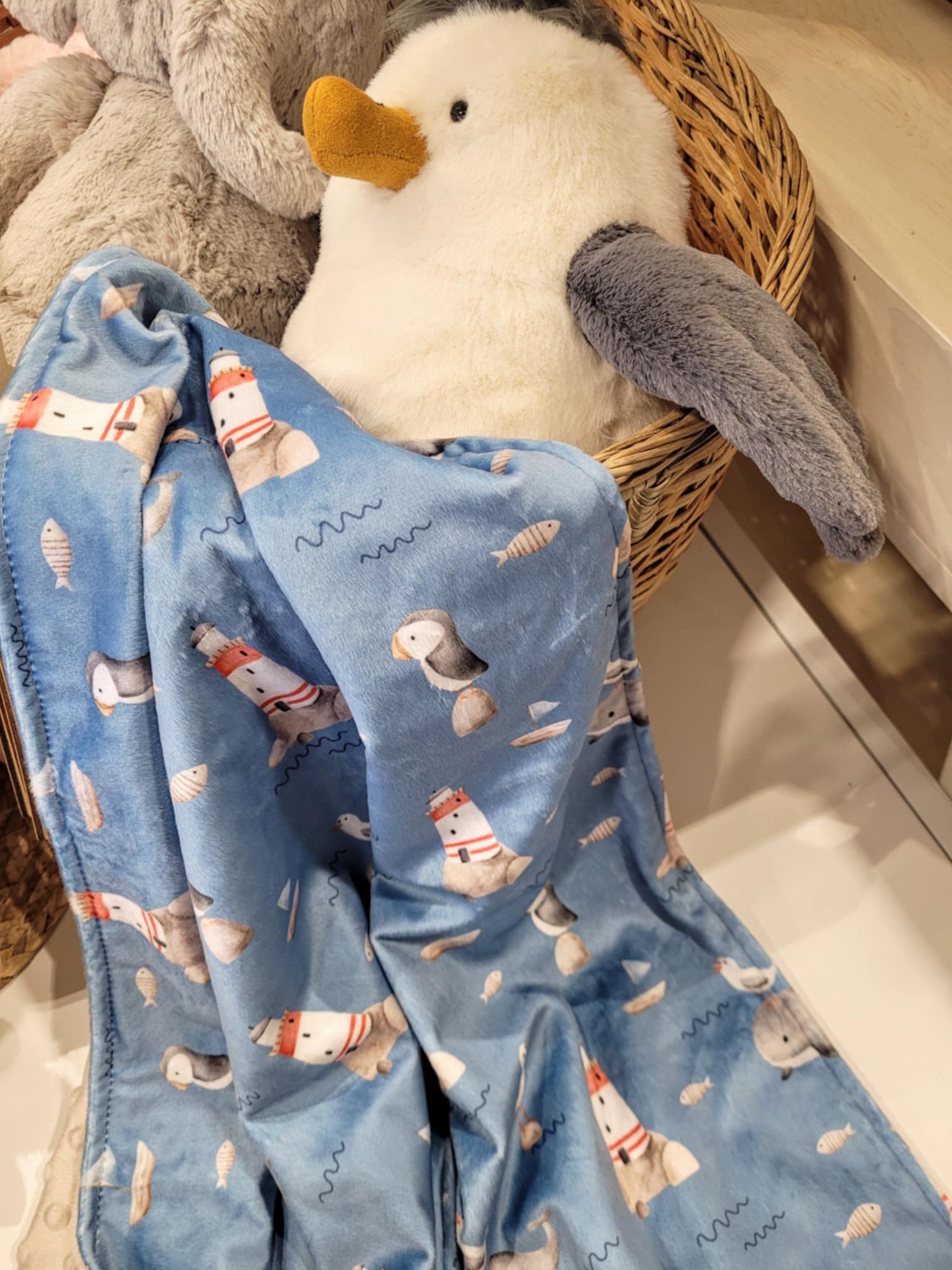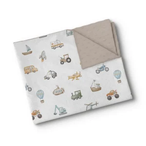 Grande couverture tout en minky. Entièrement en minky à motif d’un côté et en minky dot uni de l’autre.