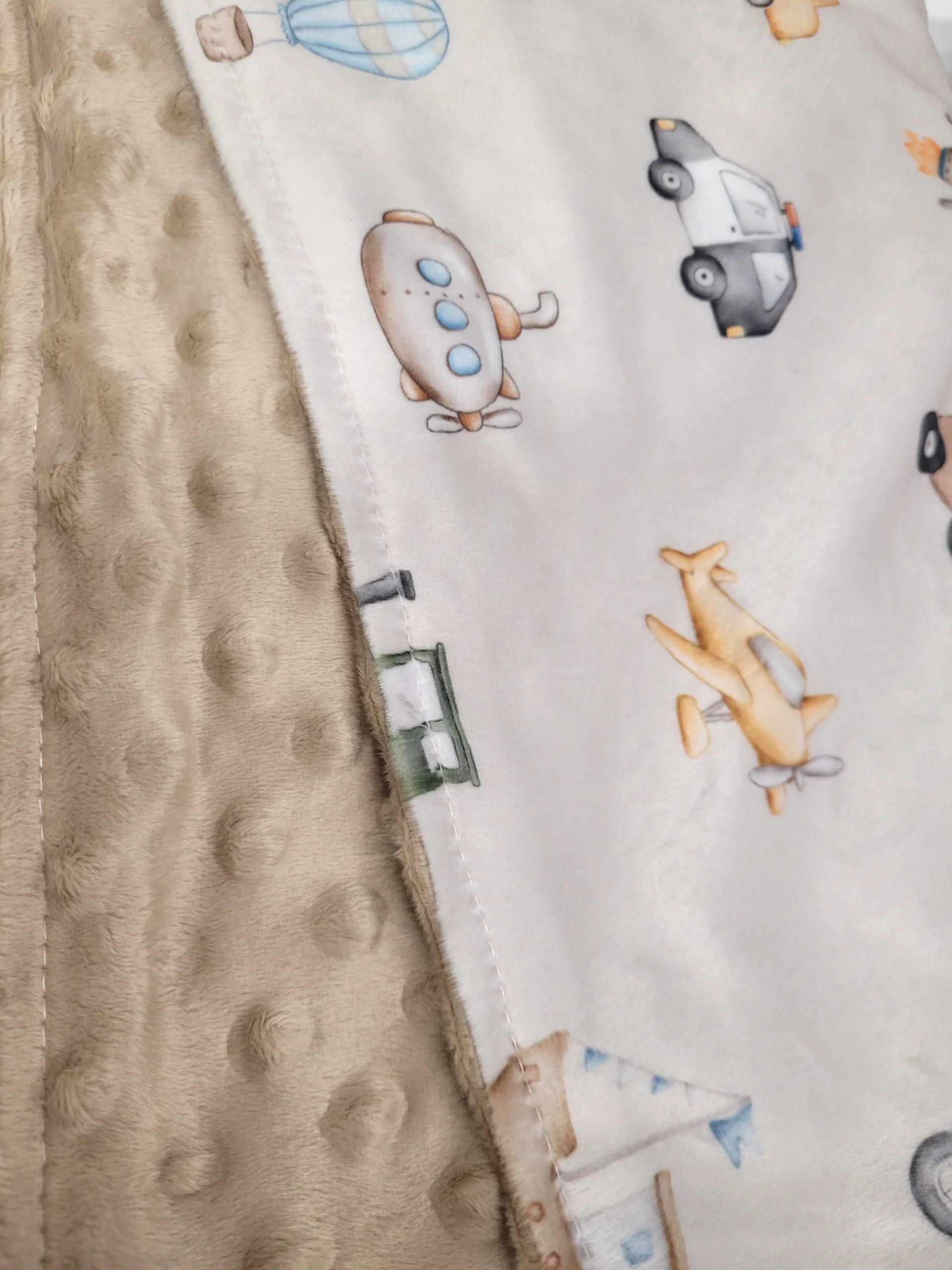 Grande couverture tout en minky, à motif d’un côté et en minky dot uni de l’autre (beige).