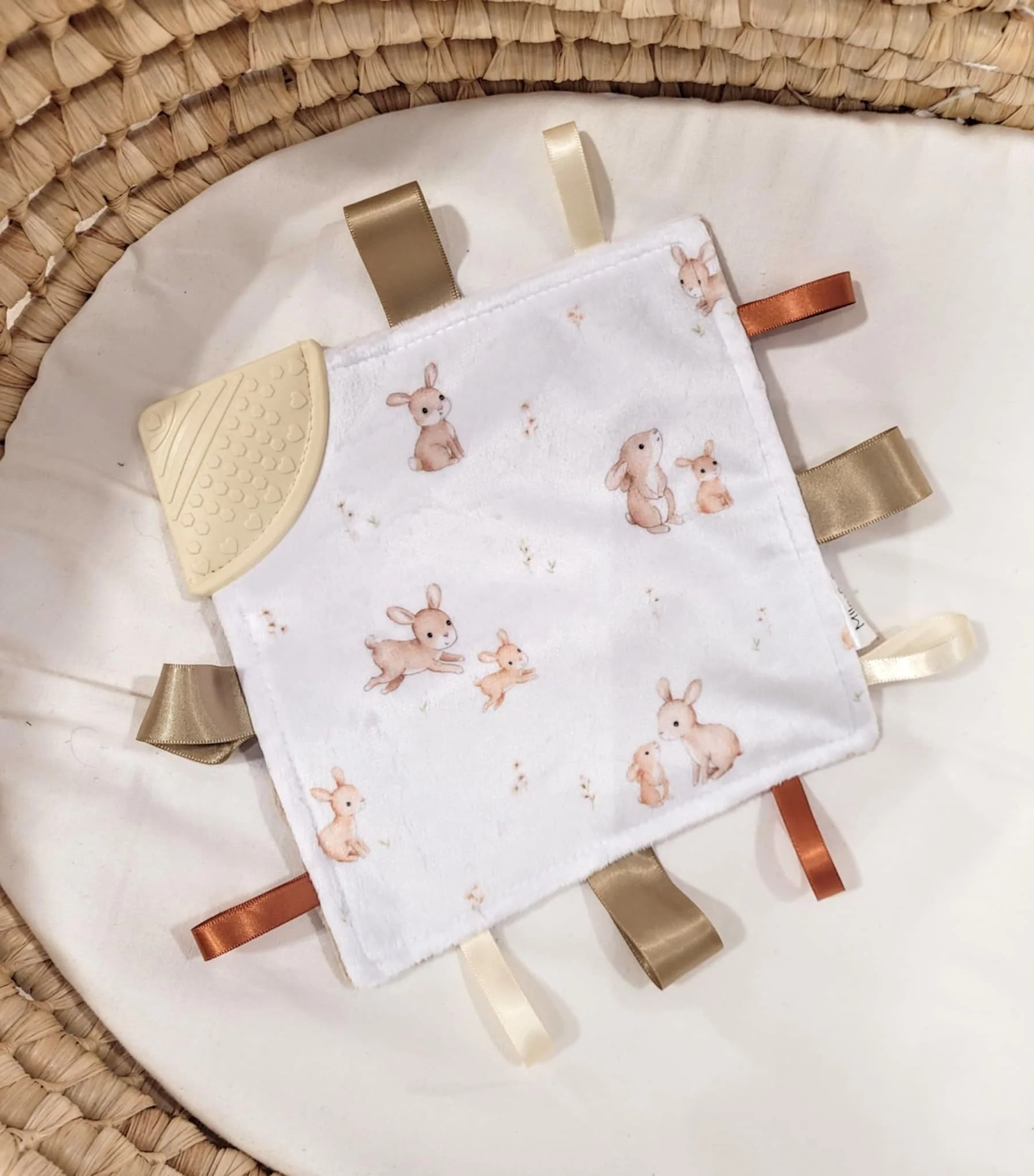 Découvrez nos adorables doudous conçues pour l’éveil de vos tout-petits. Dotées de petits rubans et d’un coins en silicone irrésistiblement croquants, elles seront un allié pour soulager les petites dents en pleine croissance.