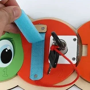 Votre enfant apprend à faire seul sur notre Planche Montessori Fermeture Chenille: attacher une boucle, fermer un zip, faire un nœud…