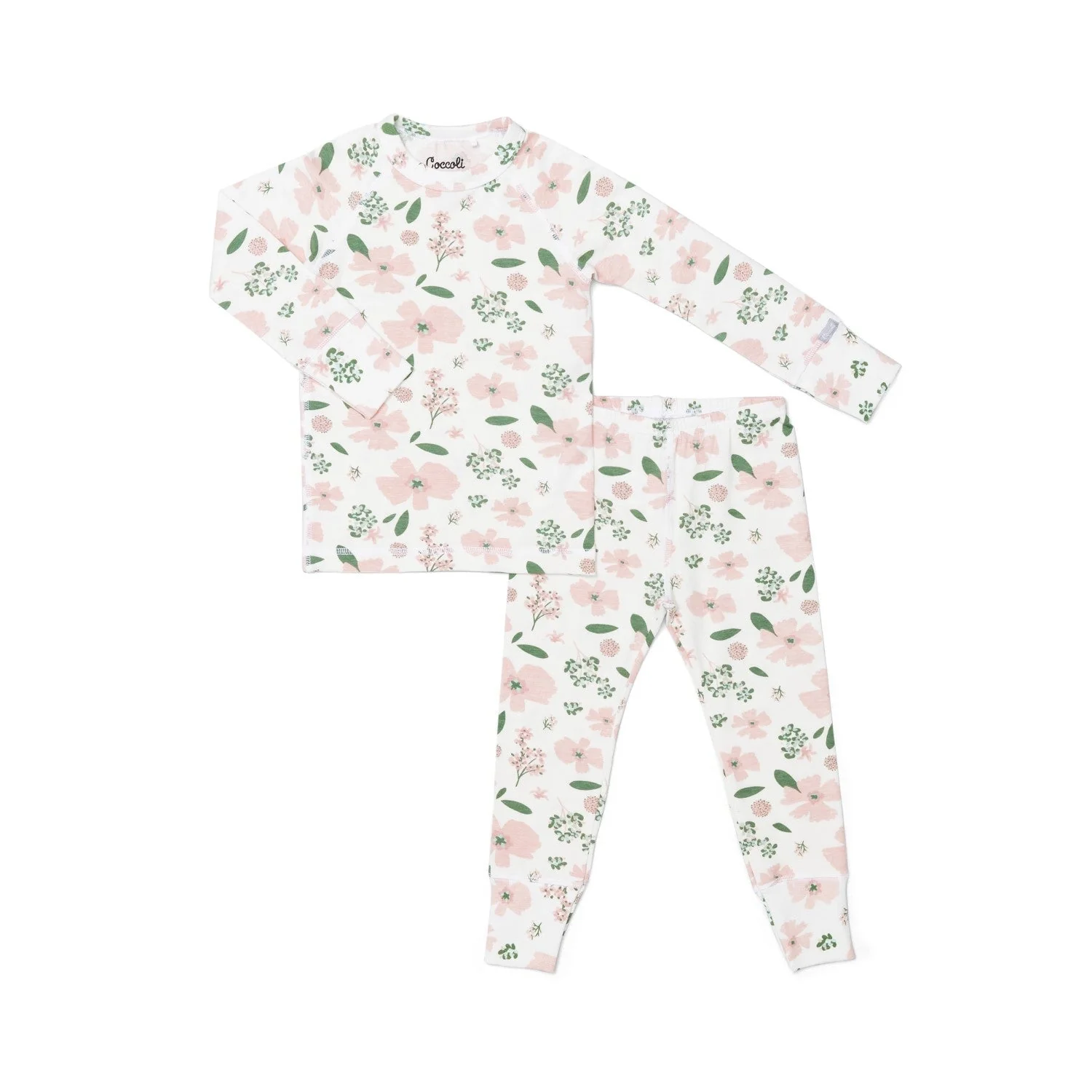 Pyjama 2 pièces fonds rose pâle avec motifs floral en coton modal.
