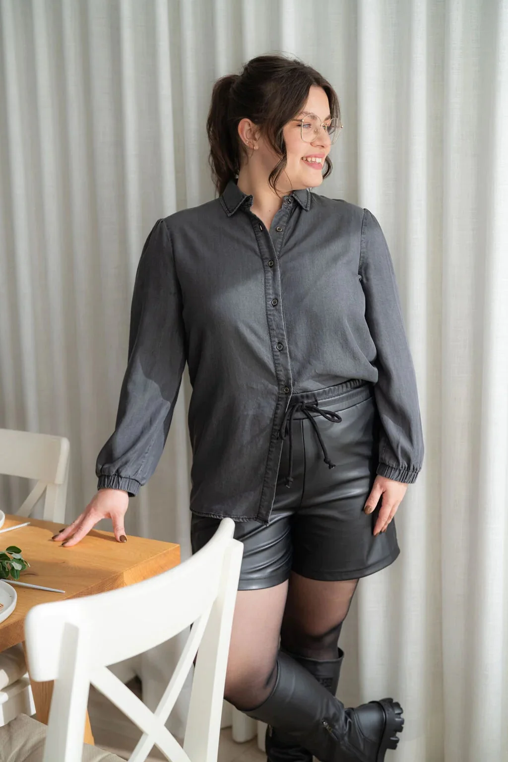 Les nouvelles shorts en similicuir sont parfaites pour s’agencer avec notre blouse en lyocell, en plus d’être des plus confortables pour profiter du temps des Fêtes!