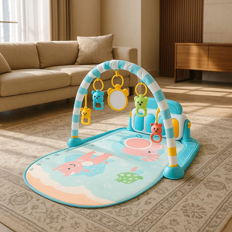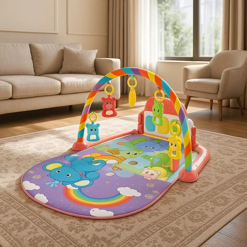 Les jouets suspendus l’incitent à lever la tête et à tendre les bras, renforçant sa musculature sans même qu’il s’en aperçoive.